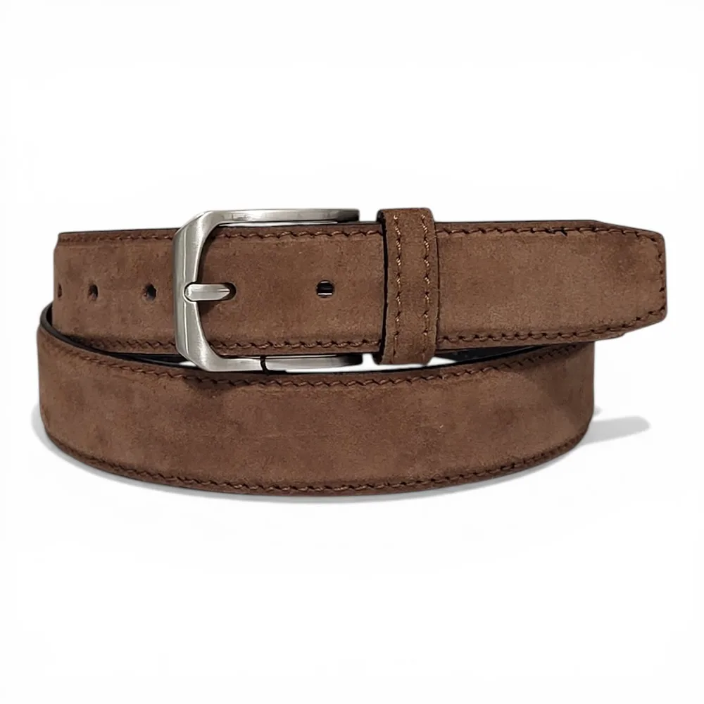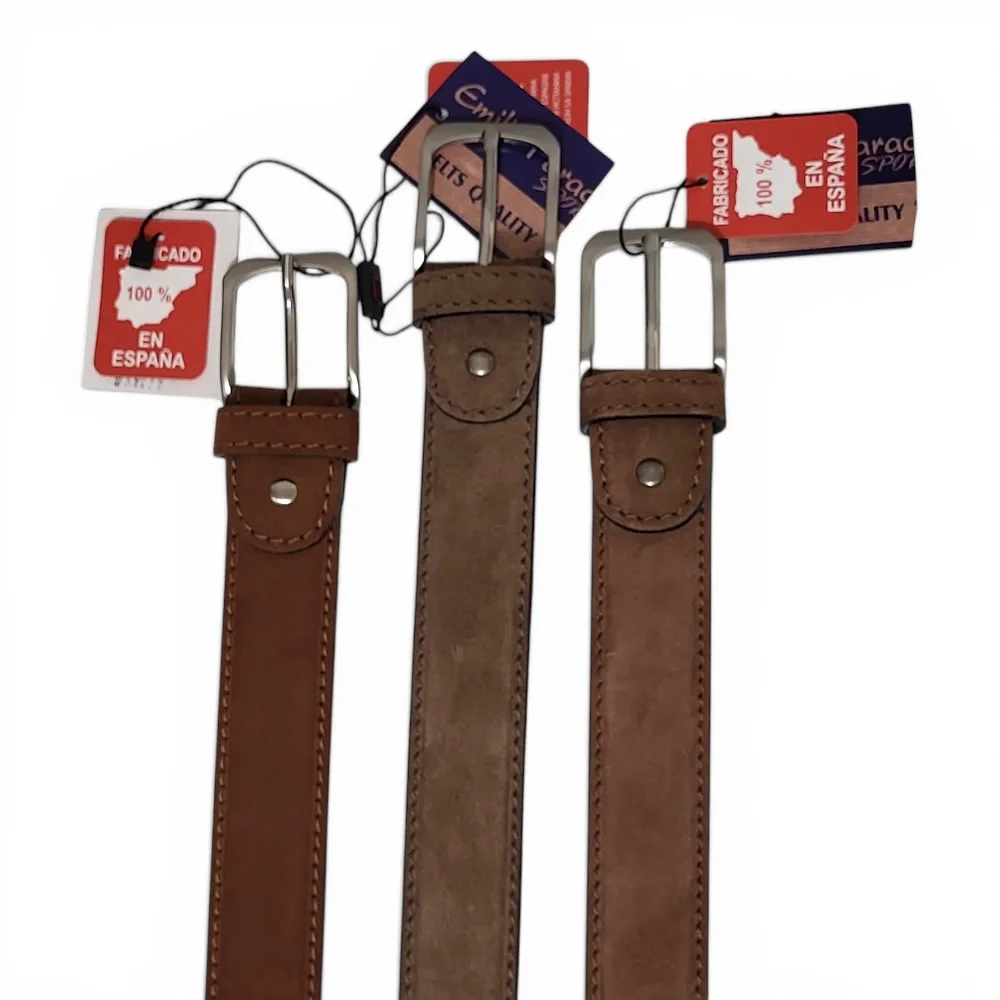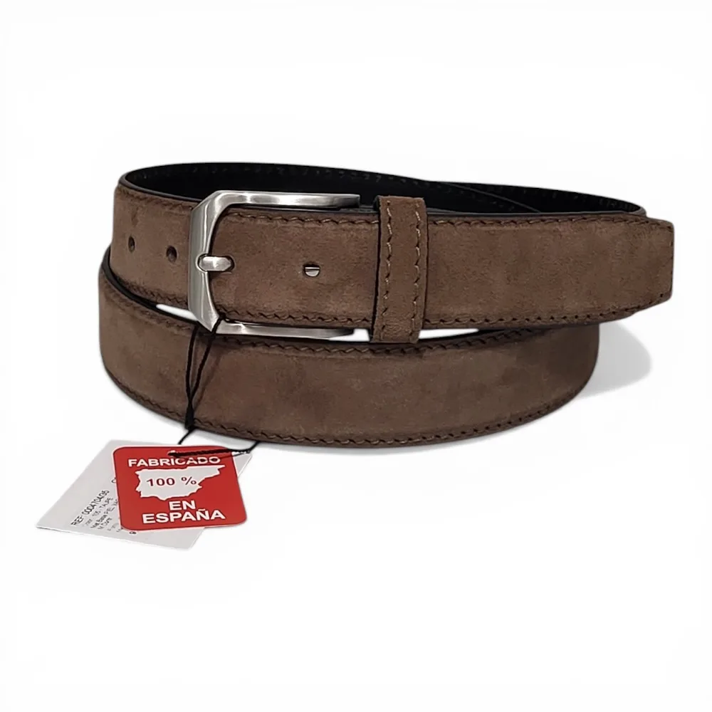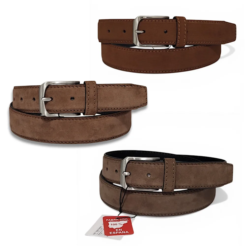 Cinturón cuero(ante) de hombre. Fabricado 100% en España, Cinturón de cuero artesanal, elegante y resistente, con hebilla metálica plateada y acabado moderno. Ideal para looks casuales o formales con estilo clásico diario. Con opción de cambiar hebilla y ajustar tamaño a una talla menos en el cinturón. Limpiar con paño húmedo, evitar humedad excesiva.